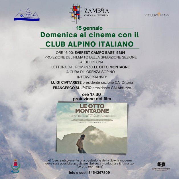 Interverranno il presidente della sezione Cai di Ortona, Luigi Civitarese e il presidente Cai Abruzzo Francesco Sulpizio; non mancheranno altri storici rappresentati del Cai e alla fine del film ci sarà una postazione della libreria Moderna Fabulinus e Minerva dove poter acquistare libri dedicati alla montagna ed il romanzo "Le otto montagne" che si concentra sulla storia di Pietro un ragazzo di città , che si reca in montagna solo per trascorrere le vacanze estive, e Bruno un pastore che in mezzo ai monti ci vive tutto l’anno. I due si conoscono fin da bambini, quando passavano le giornate in mezzo alle montagne per lunghe passeggiate, stringendo una forte amicizia. Vent’anni dopo, Pietro ormai uomo, torna in alta quota per ritrovare se stesso e fare pace con il suo passato. Del cast del film fanno parte anche: Filippo Timi ed Elena Lietti.