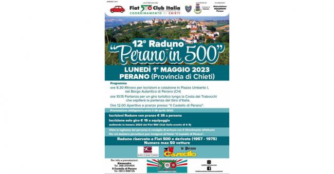 L’evento, riservato ai modelli Fiat 500 e derivati prodotti dal 1957 al 1975, è organizzato con il patrocinio del Fiat 500 club Italia – coordinamento di Chieti e del comune di Perano e la collaborazione dell’Associazione volontari Perano.
