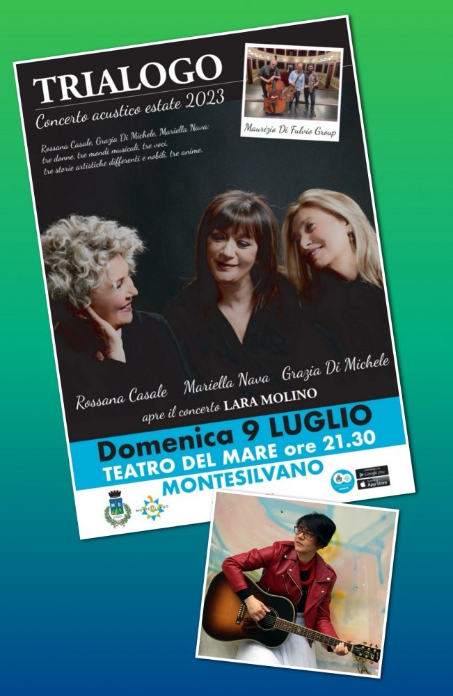Domenica 9 luglio, a Montesilvano, presso il Teatro del Mare, la cantautrice abruzzese originaria di San Salvo, Lara Molino, aprirà il concerto di Mariella Nava, Rossana Casale e Grazia Di Michele.