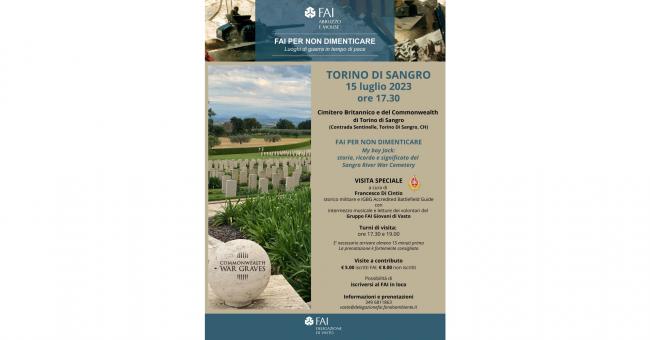 Nell’ambito della rassegna di eventi “FAI per non dimenticare”, sabato 15 luglio la Delegazione FAI di Vasto propone, presso il Sangro River War Cemeteri di Torino di Sangro, l’evento “FAI per non dimenticare. My boy Jack: storia, ricordo e significato del Sangro River War Cemetery” per scoprire insieme la storia, la letteratura, l’epigrafia e gli stili architettonici che racchiudono la poetica escatologica dei Cimiteri di guerra del Commonwealth.