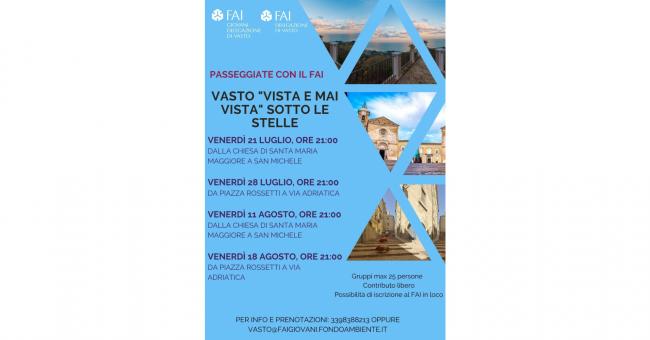 Venerdì 21 luglio, dalle ore 21, tornano le Passeggiate con il FAI Vasto, “vista e mai vista” sotto le stelle, che si svolgeranno nel centro storico di Vasto a cura del Gruppo FAI Giovani di Vasto.