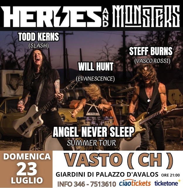 Domenica 23 luglio farà tappa a Vasto l’attesissimo concerto degli Heroes & Monsters, supergruppo formato da leggende del rock internazionale come Todd Kerns, bassista di Slash, The Age of Electric, Bruce Kulick, e altri, Stef Burns, conosciuto soprattutto per la trentennale collaborazione con Vasco Rossi, ma che vanta nella sua carriera altre importanti partecipazioni come Alice Cooper e Y&T, e Will Hunt, batterista degli Evanescence (oltre che di Vasco Rossi, Vince Neil, Tommy Lee, Slaughter ed altri).