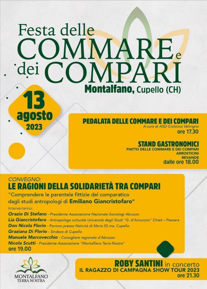 Alle ore 19.00 ci sarà il convegno dal titolo: “Le ragioni della solidarietà tra Compari” – “Comprendere le parentele fittizie del comparatico dagli studi antropologici di Emiliano Giancristoforo”. Interverranno: Orazio Di Stefano, Presidente dell’Associazione Nazionale Sociologi Abruzzo; Lia Giancristoforo, Antropologa culturale dell’Università degli Studi “G. d’Annunzio” Chieti-Pescara; Don Nicola Florio, Parroco presso Natività di Maria SS.ma di Cupello; Graziana Di Florio, Sindaco di Cupello; Manuele Marcovecchio, Consigliere regionale abruzzese e promotore della legge sul dialetto in Abruzzo; e Nicola Scutti, Presidente dell’Associazione “Montalfano Terra Nostra”.