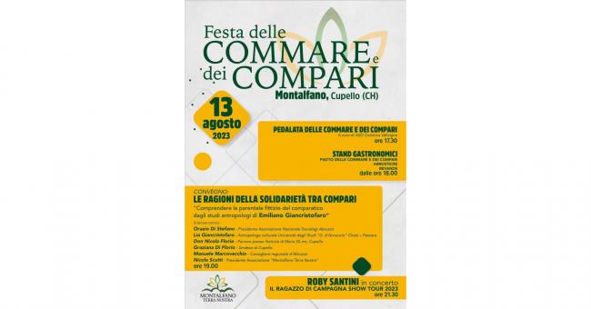 Domenica 13 agosto 2023, a Cupello in C.da Montalfano, presso Piazza Papa Giovanni Paolo II, la 5^ edizione della Festa dei Compari e delle Commare a cura dell’Associazione Montalfano Terra Nostra. L’evento è promosso e patrocinato dal Comune di Cupello e rientra nel calendario estivo 2023.
