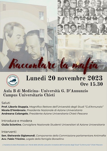“Raccontare la mafia” è il titolo scelto dai ragazzi dell’associazione per il convegno che si terrà lunedì 20 novembre 2023, presso l’Aula B di medicina dell’Università degli Studi “Gabriele D’Annunzio, Campus di Chieti, dalle ore 15.30.