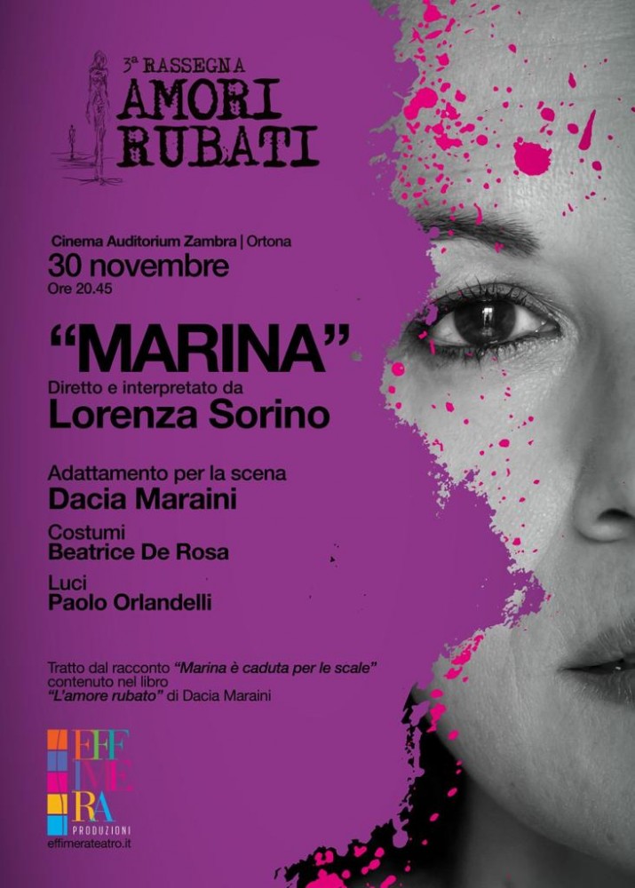Il progetto di Effimera approda il 30 novembre alle 20.45 presso il Cinema Auditorium Zambra di Ortona gestito da Unaltroteatro di Arturo Scognamiglio e Lorenza Sorino con lo spettacolo di quest'ultima e facente parte del progetto "Marina", tratto dal racconto Marina è caduta per le scale di Dacia Maraini.