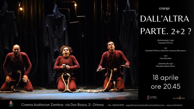 Il Cinema Auditorium Zambra di Ortona chiude la stagione teatrale con i giovani artisti della produzione Putéca Celidònia/Cranpi e lo spettacolo "Dall’altra parte| 2+2=?", il progetto con cui hanno vinto il Premio Giovani Realtà del Teatro 2019 a Udine: dopo aver debuttato al Napoli Teatro Festival Italia 2020 lo spettacolo è andato in scena al Piccolo Teatro di Milano nell’ambito di TRAMEDAUTORE 2021 per poi diventare un podcast per Radio Tre Teatro.