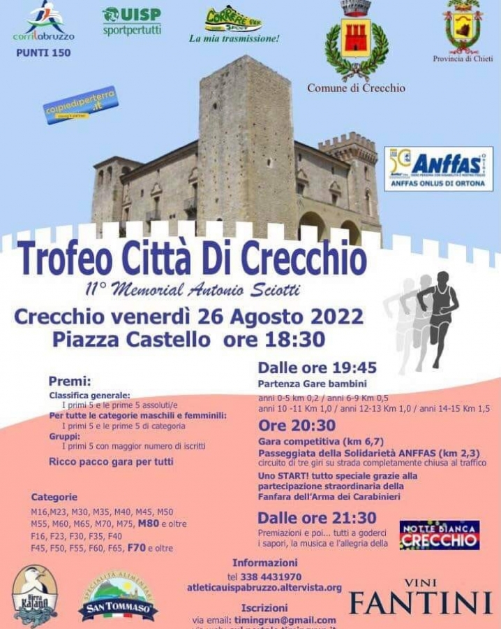Il calendario estivo podistico abruzzese trova momenti particolarmente caldi e dinamici come quelli che si stanno per rivivere a breve a Crecchio, all’ombra del Maniero, dopo due edizioni di stop a causa della pandemia.