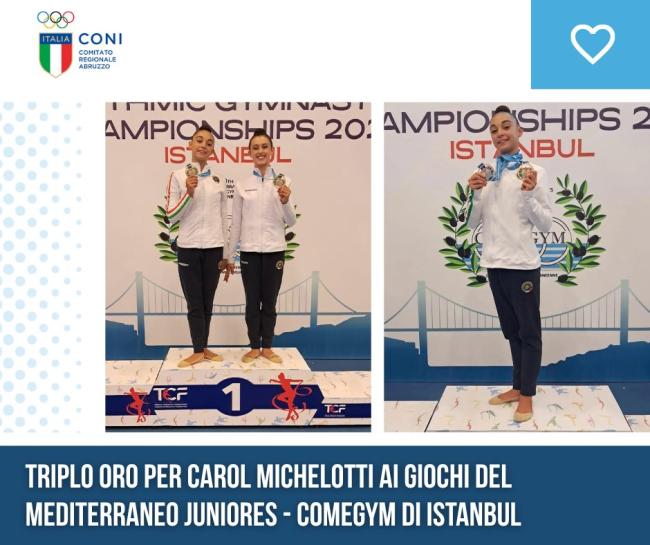 Il Comitato Regionale Coni Abruzzo esprime con orgoglio le più vive congratulazioni a Carol Michelotti, protagonista assoluta ai Giochi del Mediterraneo Juniores – Comegym in corso a Istanbul, dove ha conquistato ben tre medaglie d’oro nella ginnastica ritmica.