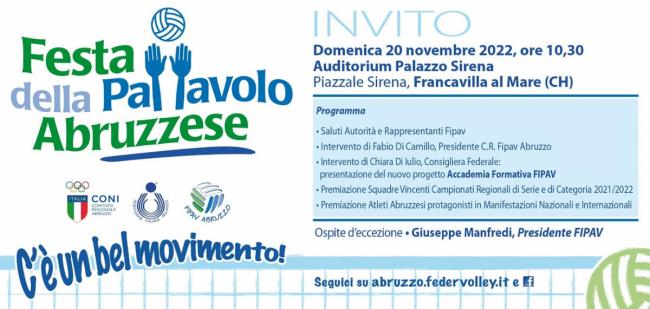 Appuntamento domenica 20 novembre, dalle ore 10,30 presso l'Auditorium di Palazzo Sirena a Francavilla al Mare, per la Festa della Pallavolo Abruzzese.
