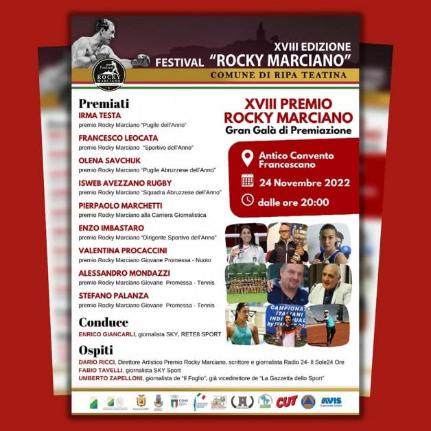 Il Premio Rocky Marciano diventa maggiorenne e si appresta a “festeggiare la maggiore età” giovedì 24 novembre dalle ore 20 nella suggestiva cornice dell'Antico Convento Francescano a Ripa Teatina.