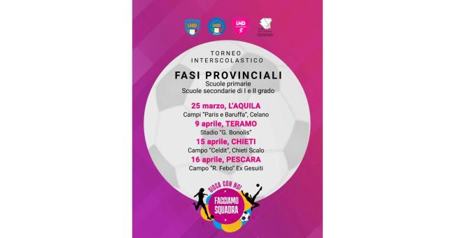 Al via oggi la quarta edizione del torneo interscolastico di calcio femminile “Gioca con noi, facciamo squadra”, iniziativa ormai strutturale nella programmazione del calcio giovanile femminile abruzzese, promossa dalla LND Abruzzo in collaborazione con il Settore Giovanile e Scolastico, l’Ufficio Scolastico Regionale per l’Abruzzo e con il coinvolgimento del Coni.