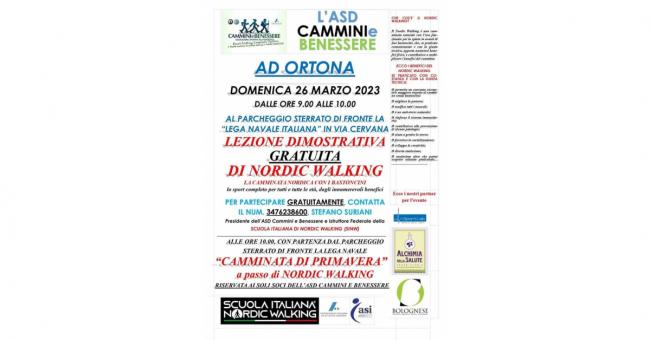 Una lezione dimostrativa gratuita di Nordic Walking per festeggiare l’inizio della primavera. E’ questa la proposta dell’Asd Cammini e Benessere, per domenica 26 marzo ad Ortona, dalle ore 9.00 alle ore 10.00, con ritrovo al parcheggio sterrato di fronte la Lega Navale Italiana in via Cervana.