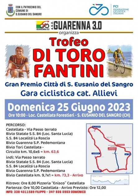 Una manifestazione voluta per il terzo anno di fila nel ricordo di due figure carismatiche e di spicco del ciclismo abruzzese come Mario Di Toro e Giuseppe Fantini. Da coprire un tracciato a circuito di 73 chilometri che si snoda lungo le strade della valle del Gogna con partenza (alle 10:00) e arrivo presso la contrada Castellata Forestieri (all’altezza della pizzeria Enrico).