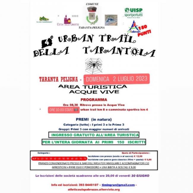 Fervono a Taranta Peligna i preparativi per organizzare nel migliore dei modi la quarta edizione dell’Urban Trail della Tarantola, a cura delle associazioni locali, la supervisione dell’Asd Vini Fantini e dell’amministrazione comunale per l’evento podistico programmato domenica 2 luglio.