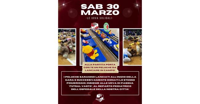 L’invito agli sportivi è di presentarsi nell’impianto di via Silvio Pellico con un peluche da lanciare dagli spalti che successivamente, insieme alle Uova di Pasqua targate ‘Futsal Vasto‘, saranno consegnati al reparto di Pediatria dell’Ospedale ‘San Pio da Pietrelcina’ di Vasto e ai bimbi delle case famiglia del territorio.