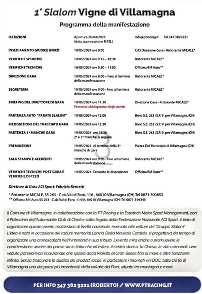 Ecco allora che viene accolta con enorme interesse l’iniziativa del Comune di Villamagna, del sindaco Renato Sisofo e delle tante aziende locali, di proporre una Gara di Slalom per domenica 19 maggio.