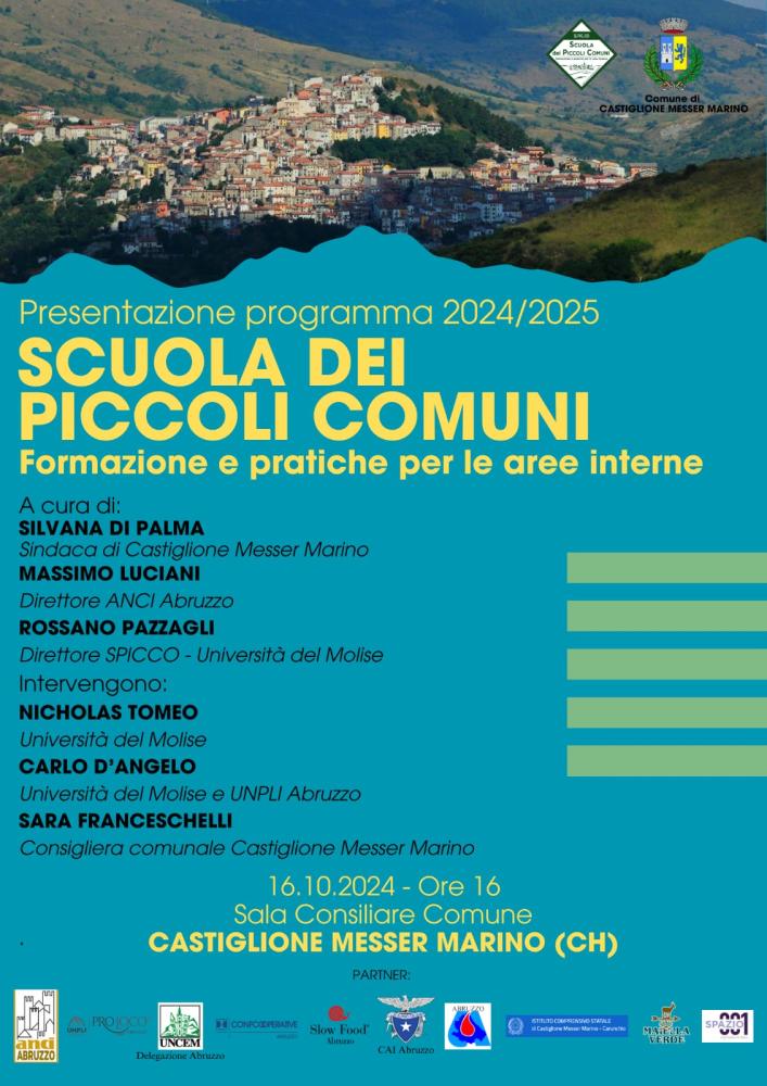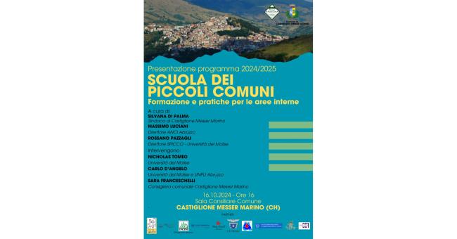 E’ prevista per mercoledì 16 ottobre alle 16, nella sala consiliare comunale (Castiglione Messer Marino, Via Erasmo Colapietro, 100) la presentazione ufficiale del programma degli incontri che si svolgeranno da novembre 2024 a maggio 2025.