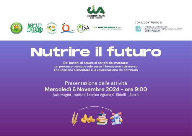 Si terrà mercoledì 6 novembre alle ore 9:30 presso l'aula magna dell'Istituto Tecnico Agrario "Cosimo Ridolfi" di Scerni, l'evento "Nutrire il futuro", un’iniziativa sostenuta dalla Camera di Commercio Chieti-Pescara, volta a sensibilizzare i giovani sull’importanza di un’alimentazione sana e sostenibile e a promuovere la valorizzazione dei prodotti locali.