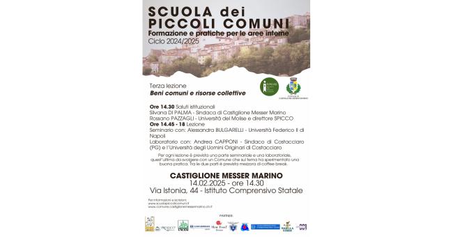 Venerdì 14 febbraio alle 14,30 riprenderanno il via le lezioni della Scuola dei piccoli Comuni di Castiglione Messer Marino dopo la pausa di gennaio. Questa terza lezione del ciclo 2024/2025, dal titolo Beni comuni e risorse collettive, vedrà la presenza della prof.ssa Alessandra Bulgarelli, storica dell'Università Federico II di Napoli, una delle più autorevoli voci italiane sul tema, il Comune di Costacciaro (PG) e l'Università degli Uomini Originari di Costacciaro, proprietaria collettiva plurisecolare sull'Appennino umbro.
