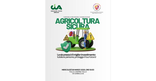 La CIA - Agricoltori Italiani Abruzzo, in collaborazione con il Servizio Prevenzione e Sicurezza negli Ambienti di Lavoro della Asl Lanciano Vasto Chieti, organizza il secondo appuntamento di "Agricoltura Sicura", un incontro dedicato alla prevenzione e sensibilizzazione sulla sicurezza nel settore agricolo.