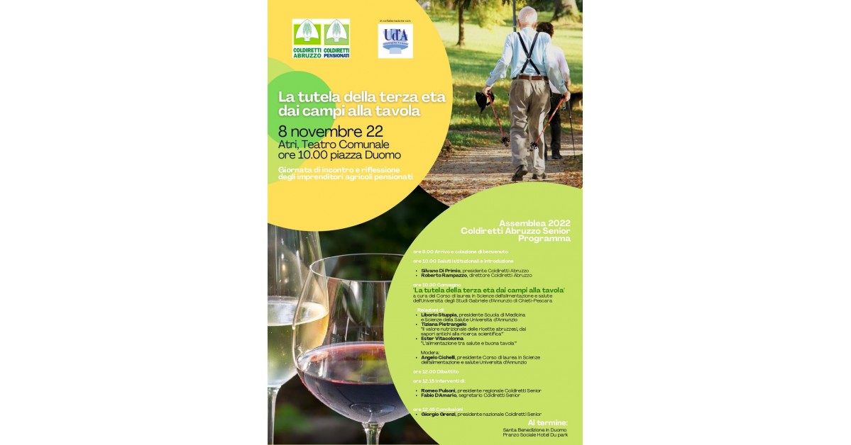 “La tutela della terza età dai campi alla tavola” è il titolo dell’incontro promosso da Coldiretti Abruzzo in collaborazione con Coldiretti Senior e il corso di laurea in Scienze dell’alimentazione dell’Università Gabriele d’Annunzio.