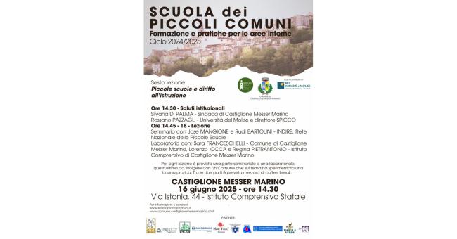 Garantire un’istruzione di qualità nelle aree interne sarà il tema del prossimo e ultimo incontro della stagione 2024/2025 della Scuola dei piccoli Comuni di Castiglione Messer Marino, in programma lunedì 16 giugno a partire dalle 14,30, nell’aula magna dell’Istituto Comprensivo statale (Via Istonia, 44).