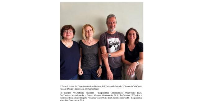Il Team della “d’Annunzio” che parteciperà ad Expo Osaka è composto da quattro Docenti del Dipartimento di Architettura: Alessio D’Onofrio, Coordinatore e Responsabile del Progetto “Tessiture: FiLA ad Osaka”, Rossana Gaddi, Responsabile scientifico dell’Osservatorio “FiLA”, Raffaella Massacesi, Responsabile della comunicazione, e Luciana Mastrolonardo, Project manager. Il Gruppo di Ricerca, guida dal Dipartimento di Architettura della “d’Annunzio”, è formato dall’area scientifica del Design (Laura Boffi, Massimo Di Nicolantonio, Davide Galieri, Simone Giancaspero, Antonio Marano, Letizia Michelucci, Emilio Rossi), dell’Architettura (Giulia Candeloro, Valentina Ciuffreda, Luciana Mastrolonardo e Donatella Radogna) e della Merceologia (Maria Gabriella Iacutone, Andrea Raggi e Raffaella Taddeo).