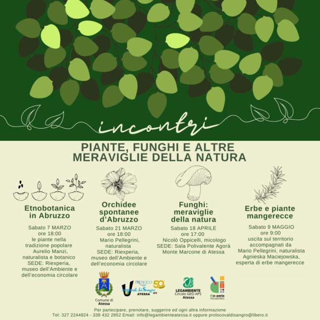 In Abruzzo sono in programma diversi appuntamenti per scoprire il mondo delle piante e la biodiversità della natura selvatica: il Circolo Legambiente Atessa APS e la Pro Loco Val di Sangro Atessa APS, con il Patrocinio del Comune di Atessa, in collaborazione con Riexperia, Museo dell’Ambiente e dell’economia circolare, promuovono, infatti, il ciclo di incontri “PIANTE, FUNGHI ED ALTRE MERAVIGLIE DELLA NATURA” a partire dal 7 marzo – alle ore 18:00 Presso il Museo RIEXPERIA - Presentazione del libro: “ETNOBOTANICA IN ABRUZZO: le piante della tradizione popolare” (Casa editrice META), di Aurelio Manzi, naturalista e botanico abruzzese, studioso e divulgatore della natura e del paesaggio dell’Appennino centrale; il 21 marzo, alle ore 18:00 Presso il Museo RIEXPERIA – “Le ORCHIDEE spontanee d’Abruzzo”, a cura di Mario Pellegrini, Direttore della Riserva Nat. Regionale Abetina di Rosello, naturalista; sabato 18 aprile alle ore 17:00 Sala polivalente Montemarcone – “FUNGHI: MERAVIGLIE DELLA NATURA”, con NICOLÒ OPPICELLI, Micologo, giornalista e autore di numerose pubblicazioni sul regno dei funghi, divulgatore scientifico e guida naturalistica. Collabora con la nota trasmissione televisiva Geo – Rai3. Sabato 9 maggio, incontro all’aperto alla scoperta di “ERBE E PIANTE SPONTANEE COMMESTIBILI (O EDIBILI)” con Mario Pellegrini, naturalista e Agnieszka Maciejowska, esperta di erbe spontanee commestibili e piante officinali.