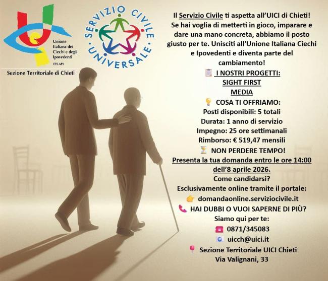 L’Unione Italiana dei Ciechi e degli Ipovedenti (UICI) – Sezione Territoriale di Chieti apre ufficialmente le selezioni per il nuovo bando di Servizio Civile Universale.