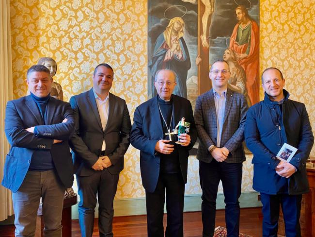 all’arcivescovo di Chieti Vasto S.E. Bruno Forte da Francesco Perillo (direttore Coldiretti Chieti), Camillo Saraullo e Daniele Giangiulli (presidente e direttore generale di Confartigianato Imprese Chieti-L’Aquila), Giuseppe Rossi (presidente territoriale).