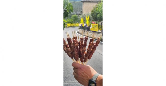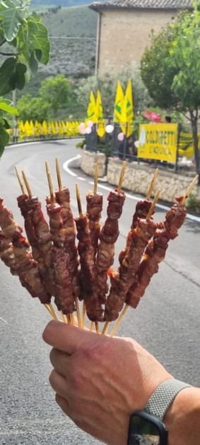 Una tappa golosa per la carovana del Giro d'Italia che, ieri pomeriggio, prima di arrivare in quota a Campo Imperatore, passando di fronte all'agriturismo Sapori di Campagna di Ofena, ha trovato centinaia di bandiere e striscioni gialli e i corridori hanno preso 'al volo' gli arrosticini preparati per i ciclisti da Coldiretti L’Aquila. Un modo simpatico e sicuramente indimenticabile per promuovere la terra d'Abruzzo in occasione dell'evento ciclistico più seguito dell'anno.