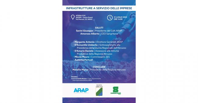 Ad aprire il lavori saranno oltre al presidente Savini, il ceo di Sangritana, Alberto Amoroso: interverranno Umberto D'Annuntiis, sottosegretario alla presidenza della giunta regionale d'Abruzzo con delega alle infrastrutture, Daniele D'Amario, assessore regionale alle Attività produttive, Mauro Miccio, commissario Zes, Antonio Morgante, direttore generale Arap. Le conclusioni saranno affidate al presidente della Regione Abruzzo, Marco Marsilio. A moderare i lavori Romeo Ciammaichella, capo dipartimento internazionalizzazione di Arap.