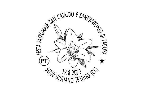 In occasione della festa patronale di San Cataldo e San’Antonio di Padova, nella giornata di sabato 19 agosto Poste Italiane attiverà a Giuliano Teatino un servizio filatelico temporaneo con bollo speciale con la dicitura «FESTA PATRONALE SAN CATALDO E SAN’ANTONIO DI PADOVA», richiesto dal Comune di Giuliano Teatino.