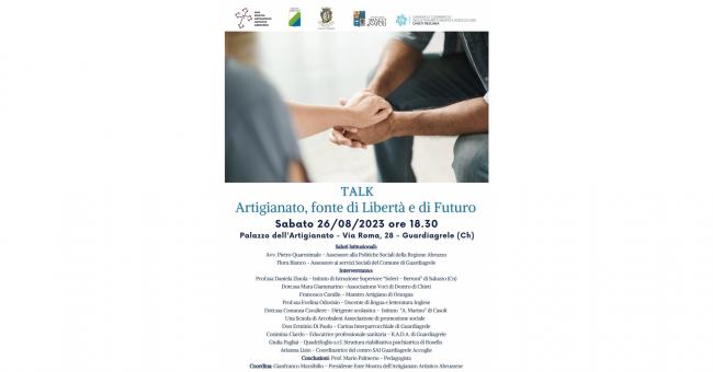 Ancora un appuntamento di rilievo nell’ambito della 53^ Mostra dell’Artigianato artistico abruzzese in corso a Guardiagrele. A pochi giorni dalla chiusura, si parlerà di sociale, in un incontro che si terrà sabato, 26 agosto, alle 18.30 nella Sala Rocco Di Giuseppe del Palazzo dell'Artigianato. Il tema sarà “TALK -Artigianato, fonte di Libertà e di Futuro".