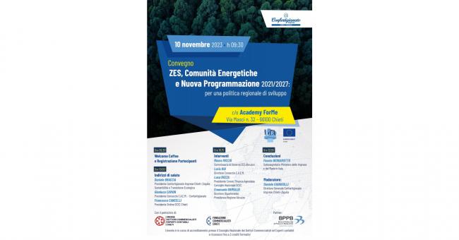 “ZES, Comunità Energetiche e Nuova Programmazione 2021/2027: per una politica regionale di sviluppo”: è il titolo del convegno che si svolgerà domani, venerdì 10 novembre, a partire dalle ore 9.30, nella sede di Academy ForMe, al primo piano del centro commerciale Centauro, in via Filippo Masci, a Chieti.