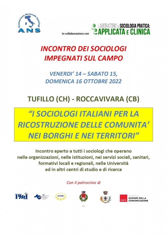 Si svolgerà venerdì 14, sabato 15 e domenica 16 ottobre l’incontro dei sociologi italiani impegnati sul campo. L’incontro è stato promosso dai Dipartimenti d’ Abruzzo e Molise dell’Associazione italiana Sociologi, diretti rispettivamente da Orazio Di Stefano e Giuseppe Colombo, in collaborazione con il Laboratorio di sociologia pratica applicata e clinica, diretto da Everardo Minardi.