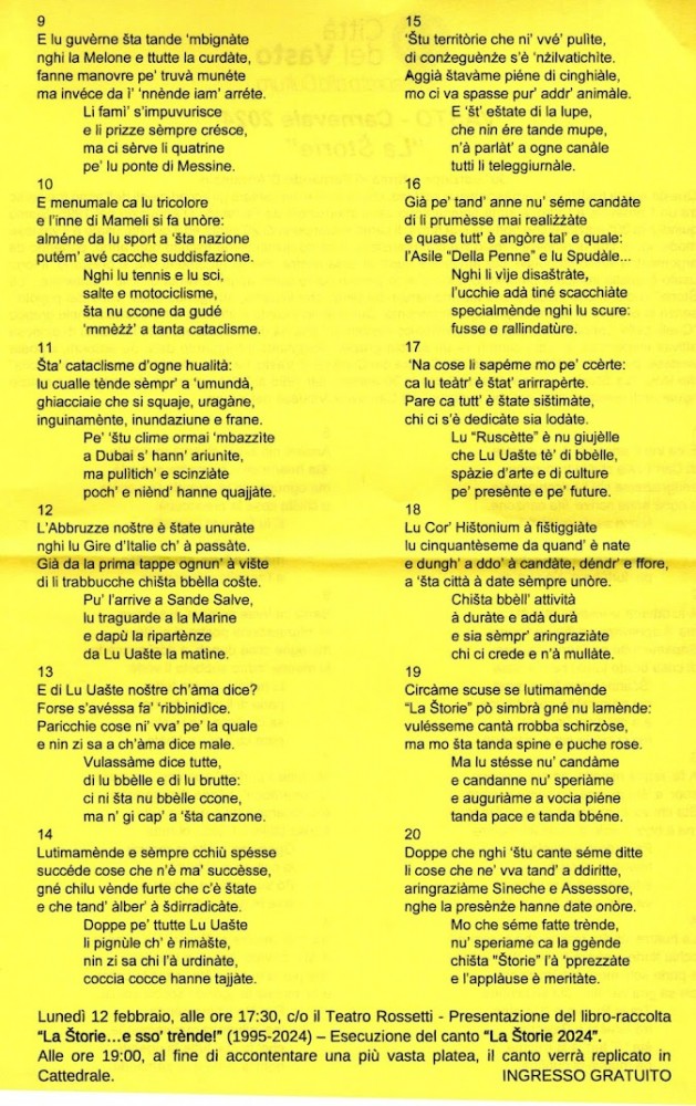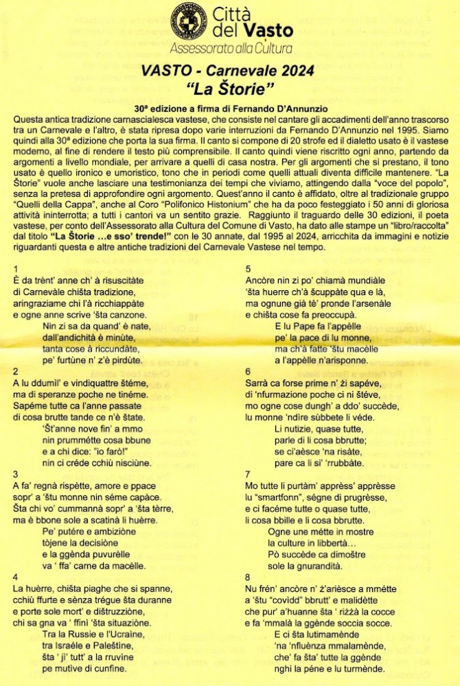 Festa grande al Teatro Rossetti di Vasto per la 30^ edizione de La Štorie di Fernando D'Annunzio, il canto di Carnevale che con ironia e satira racconta le cose belle e brutte dell’anno passato.